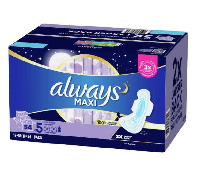 Always Maxi Feminine Pads For Women Size 5 Extra Heavy Overnight Absorbency With Wings Unscented 36 Count Pack Of 4 Package May Vary Walmart Com